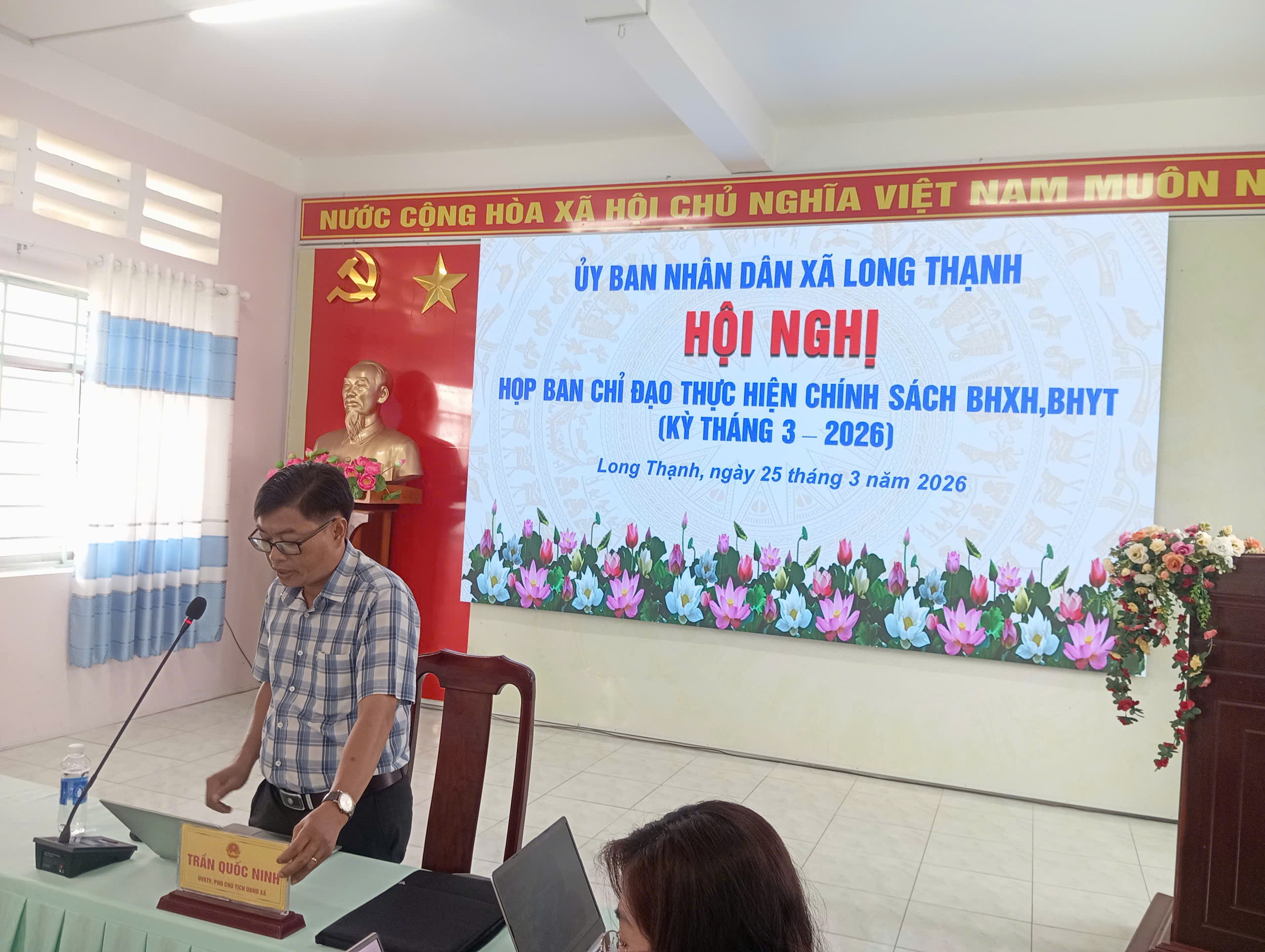Sáng ngày 25/3/2026, tại Hội trường lớn Văn phòng HĐND - UBND xã Long Thạnh, Ban Chỉ đạo thực hiện chính sách bảo hiểm xã hội, bảo hiểm y tế (BHXH, BHYT) xã Long Thạnh đã tổ chức Hội nghị Ban Chỉ đạo tháng 3 năm 2026.