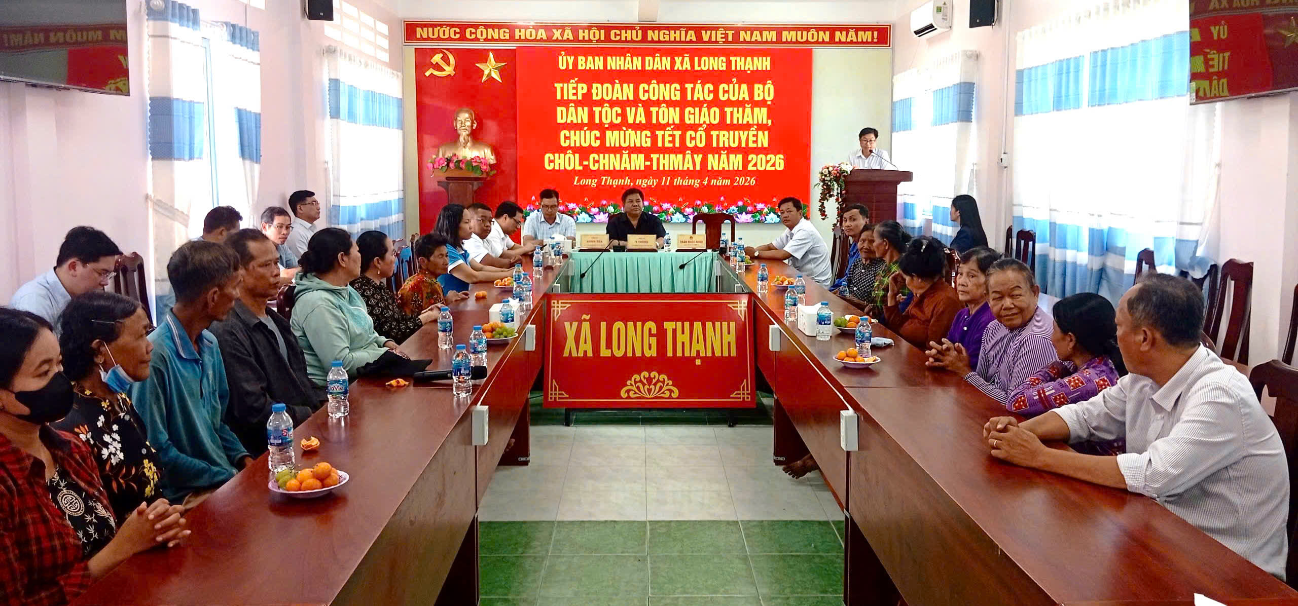 Vào lúc 14 giờ ngày 11/4/2026, Đoàn công tác của Bộ Dân tộc và Tôn giáo do đồng chí Y Thông, Thứ trưởng Bộ Dân tộc và Tôn giáo làm Trưởng đoàn đã đến thăm, chúc Tết và tặng quà cho hộ nghèo là đồng bào dân tộc Khmer trên địa bàn xã Long Thạnh.