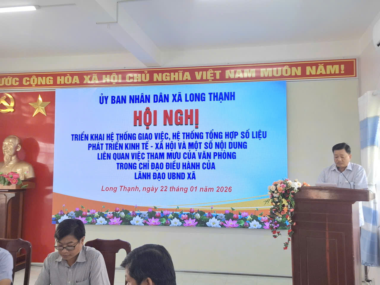 Chiều ngày 22/01/2026, UBND xã tổ chức hội nghị triển khai hệ thống giao việc và hệ thống tổng hợp số liệu kinh tế – xã hội năm 2026 và một số nội dung có liên quan việc tham mưu của Văn phòng trong chỉ đạo điều hành của Lãnh đạo UBND xãNhằm đẩy mạnh ứng dụng công nghệ thông tin trong công tác quản lý, điều hành; nâng cao hiệu quả giao việc, theo dõi tiến độ thực hiện nhiệm vụ; đồng thời chuẩn hóa công tác nhập liệu, tổng hợp số liệu kinh tế - xã hội và nâng cao chất lượng tham mưu trong chỉ đạo điều hành của UBND xã.Tham dự và chỉ đạo hội nghị có, đồng chí Nguyễn Nhiệm Toàn¸Phó chủ tịch UBND xã, Đồng chí Trần Quốc Ninh Phó chủ tịch- Giám đốc trung tâm Phục vụ hành chính công các đồng chí lãnh đạo UBND xã; cùng lãnh đạo, công chức các phòng chuyên môn thuộc UBND xã và Trung tâm Phục vụ Hành chính công.